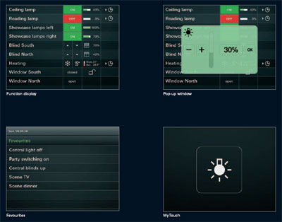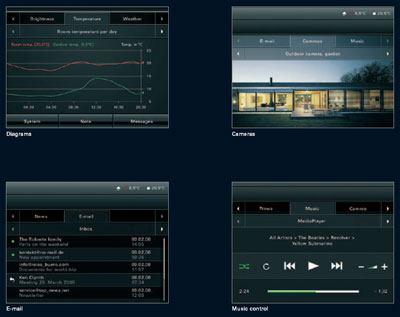 Function displayDevices in a room and their status can be seen at a glance. All functions can be directly operated from this display. Pop-up windowDetailed information and operating elements do not open up on a further level but within a pop-up above the list view. That ensures a clear operation. FavouritesA collection point for the most frequently used settings is offered by the Favourites menu item. Light scenes or often used functions for example can be stored here. MyTouchAn individual start screen allows you to configure your own background image and also to centrally place an often used function. DiagramsDetection and evaluation of consumption data functions with the aid of diagrams. Various values can be displayed according to year, month, day and hour. CamerasSeeing who is in the garden or at the gate with one operational step: views from various cameras on the grounds can be called up. Internet servicesFind out in the morning whether an umbrella must be packed for the day: weather or news services in RSS format can be displayed by the Gira Interface. With the Gira Interface e-mails can be called up, read and sorted. Music controlThe operation philosophy of the Gira Interface makes sure your favourite songs are available when you come home from work. A music archive and player are directly integrated.